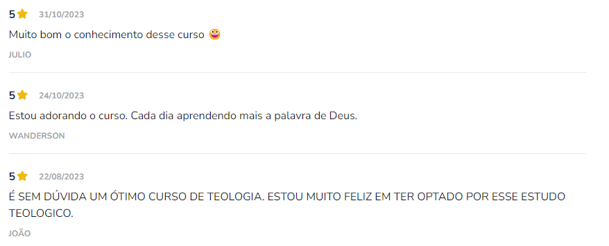 Antes de comprar eu ví essas análises e depoimentos que me ajudaram a decidir comprar o Curso de Teologia do Ministério IDE, já que tem um conteúdo excelente de estudo da bíblia.